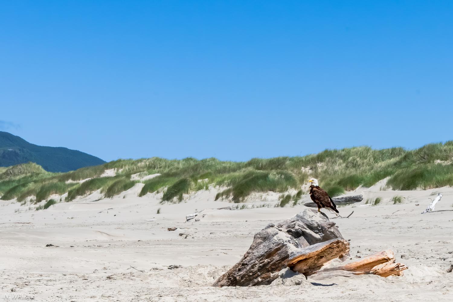 Taken on the Oregon Coast at Bayocean Peninsula. 6.24.23 STORY: while exploring the beach at Bayocean Peninsula Park on the Oregon coast, my gaze was quickly directed from the ocean to the sky. A bald eagle, decided to land on a sole log on the beach only yards away from me. For 15 minutes, the bald eagle and I were face to face taking in the ocean scape...one of those moments I was grateful to have my camera in hand!
