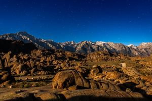 Photo taken at Alabama Hills in California. Pictured under the moonlit horizon towers Mt. Whitney and Lone Pine Peak | 5.25.24