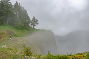 Fog Sweeps a cliff at the summit of the Archer Mountain Hike in the Columbia River Gorge, Washington, USA 5.25.20