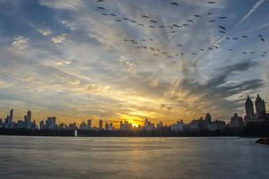 Sunset hits New York City's Central Park, while birds flock in the sky above // Winter 2018
