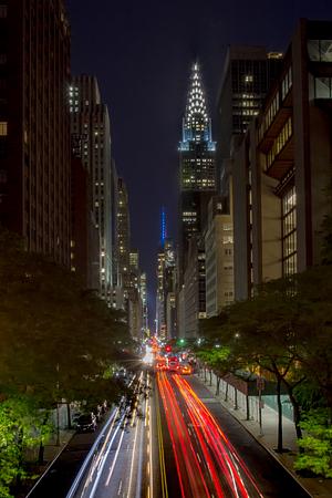 Long Exposure photograph of vehicles zipping up and down the busy streets of NYC while in the backround the Chrysler Building and Freedom Tower stand tall. NYC, NY // Spring 2018