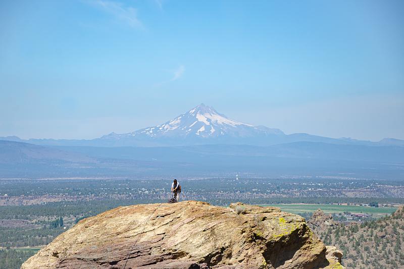 A climber successfully scales the summit of Oregon's Smith Rock's Monkey Face Rock, while Mount Hood fills the background // Summer 2019