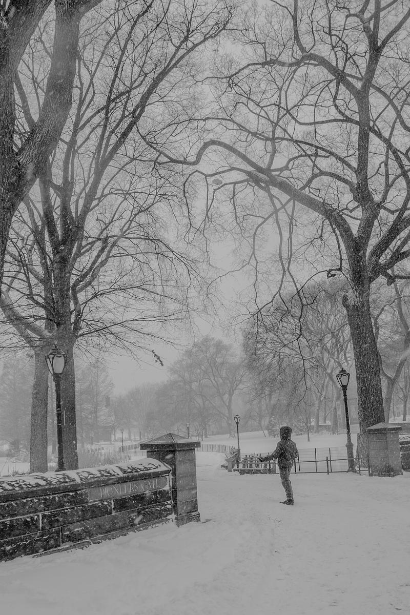 Following a 'Bomb Cylcone' snowstorm, an onlooker takes in the view by the Northern Entrance of Central Park in Manhattan // Winter 2018