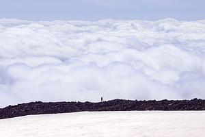 A lone backpacker standing above the clouds, while atop the rim of the summit of the South Sister Mountain (10,358ft) // Summer 2019
