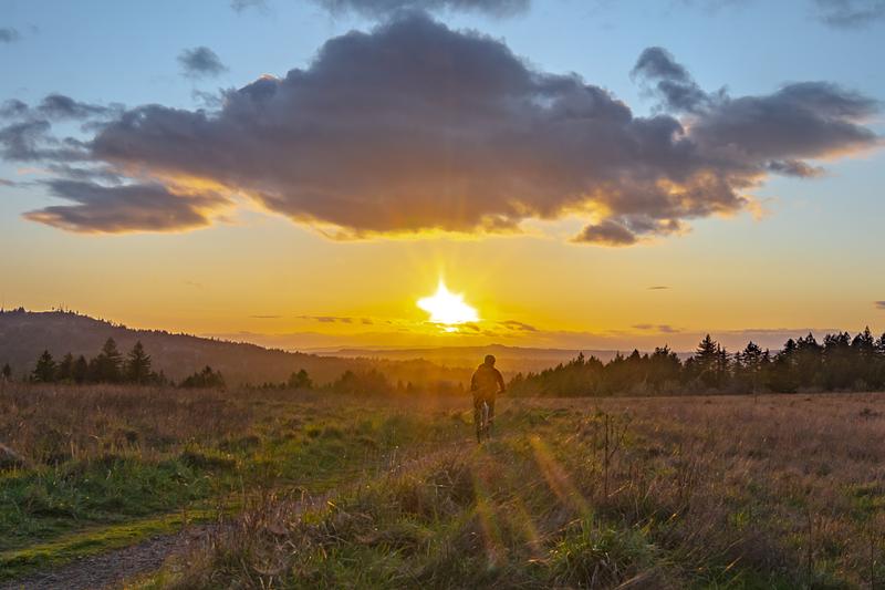 A mountain biker on Powell Butte, OR rides off into the sunset // Winter 2020