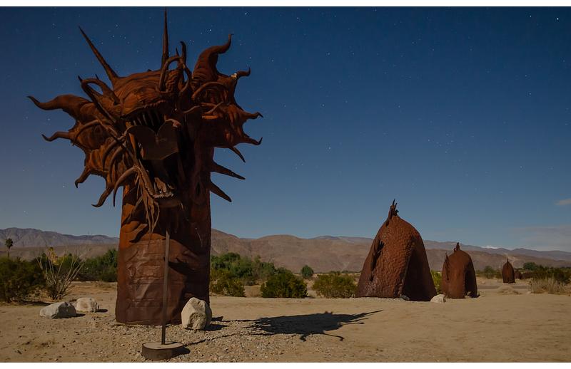 In a vast and desolate area LARGER than the state of Rhode Island, it’s quite a remarkable sight to see these metal structures inhabiting the land. In fact, if you visit this incredible area East of San Diego, be prepared to see more than 130 metal structures of creatures that were once thought to roam the landscape of the Anza-Borrego Desert, California’s largest state park. Whether it’s a gigantic dragon, a scorpion, a dinosaur, a sabertooth tigers, or a herd of elephants, just to name a few, this park is sure to bring out the best of your imagination. As you'll see from some of the images I captured, I had some fun with light trails here and was inspired by the fire breath of a dragon.... Highly suggest the visit! // Fall 2019