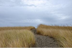 A pathway splits the tall grass surrounding Gearhart Beach in Oregon // Winter 2019