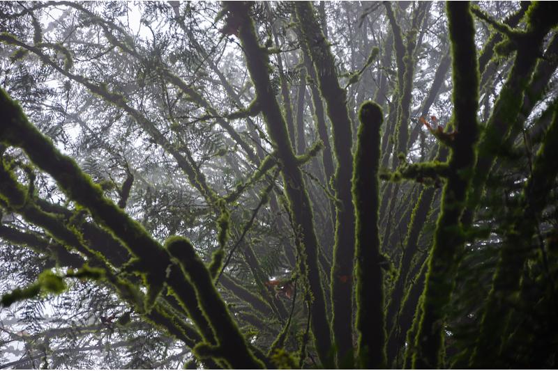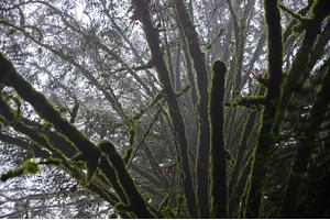 A closeup view of the mossy limbs of a tree on a foggy day in Portland, Oregon's Forest Park // Winter 2019