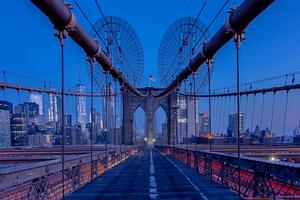Long exposure photograph of the NYC skyline, Brooklyn Bridge and cars zipping by on the bridge below at dawn. NYC, NY // Spring 2018