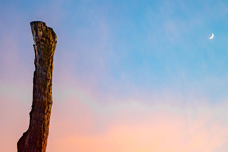 The Moon and a limbless tree share a sunset at Portland, Oregon's Mt. Tabor Park // Spring 2020