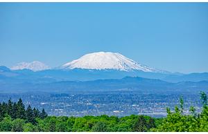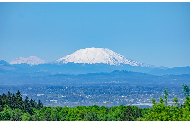 A springtime view of Portland with Mt. Saint Helens in the middle and Mt. Adams peaking through on the left. Portland, OR // Spring 2020