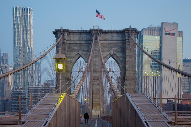Photograph of the Brooklyn Bridge and parts of the New York City Skyline at Dawn, just before a new day's sunrise // Spring 2018