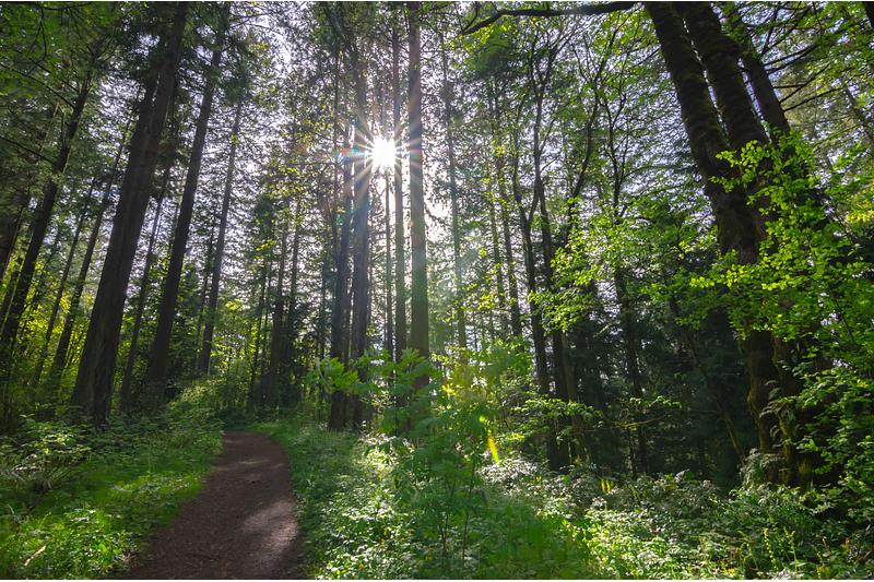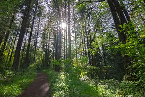The Sun shines through the towering trees in Portland, Oregon's Forest Park // Spring 2020