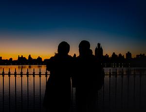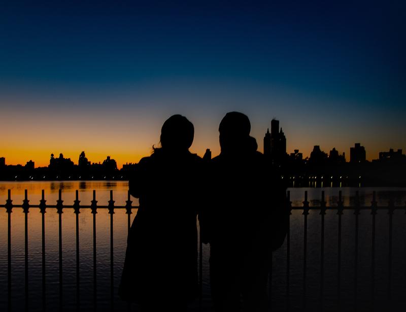 A couple soaks in the colors following sunset at the Jacqueline Kennedy Onassis Reservoir in New York City's Central Park // Fall 2018