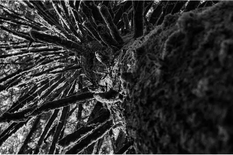 Black and white perspective below a towering tree in Portland, Oregon's Forest Park // Spring 2020